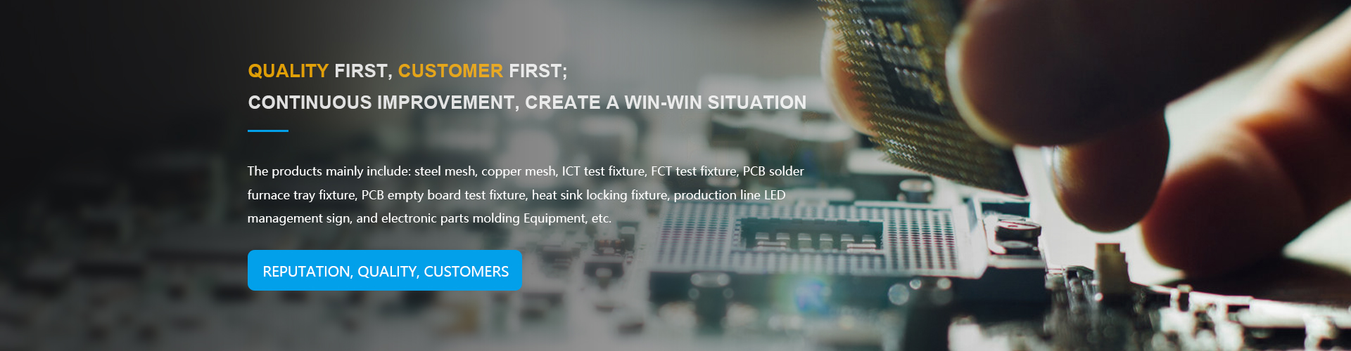 The core products of Yantai Guangqiang Electronics Co., Ltd. include: SMT steel mesh, non-standard automation equipment, tooling fixtures and carriers, and standard automation equipment. The main products include: steel mesh, copper mesh, ICT test fixture, FCT test fixture, PCB solder furnace tray fixture, PCB empty board test fixture, heat sink locking fixture, production line LED management sign, and electronic parts molding Equipment, clipping equipment, electronic product aging racks, high-sound wave equipment and SMT related consumables.
